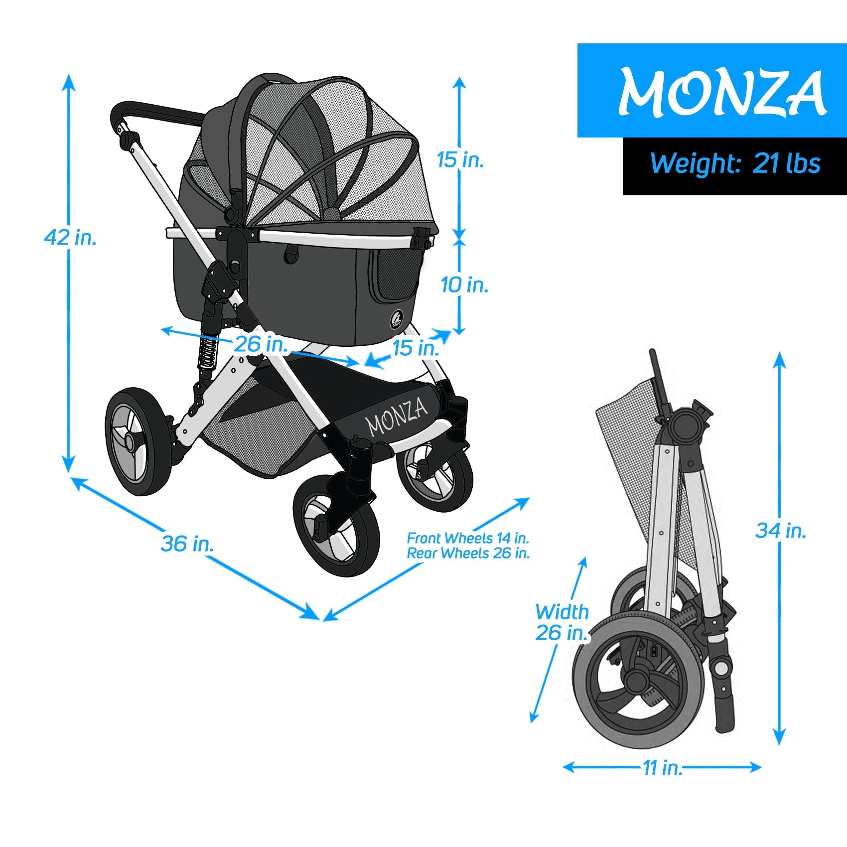 This stroller features a quick-release system which allows for you to detach your carrier* and have it as an individual car seat. The carrier accommodates for a medium-sized pet or multiple smaller-sized ones up to 50 pounds. The Monza (coil springs or suspension) allow your pet to experience a smoother and less bumpy ride and with a press of two buttons, you can collapse the entire stroller to fit in compact places.
